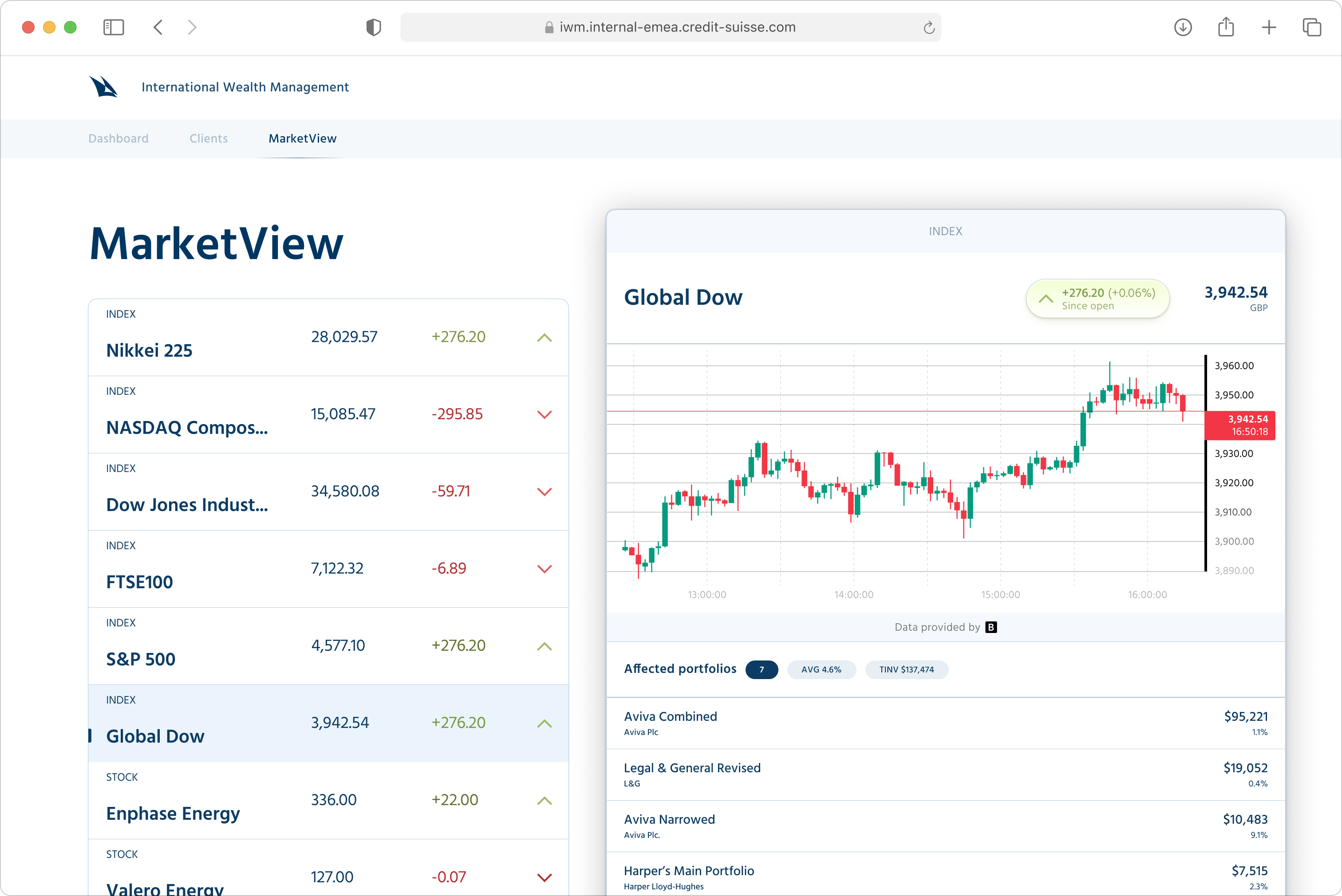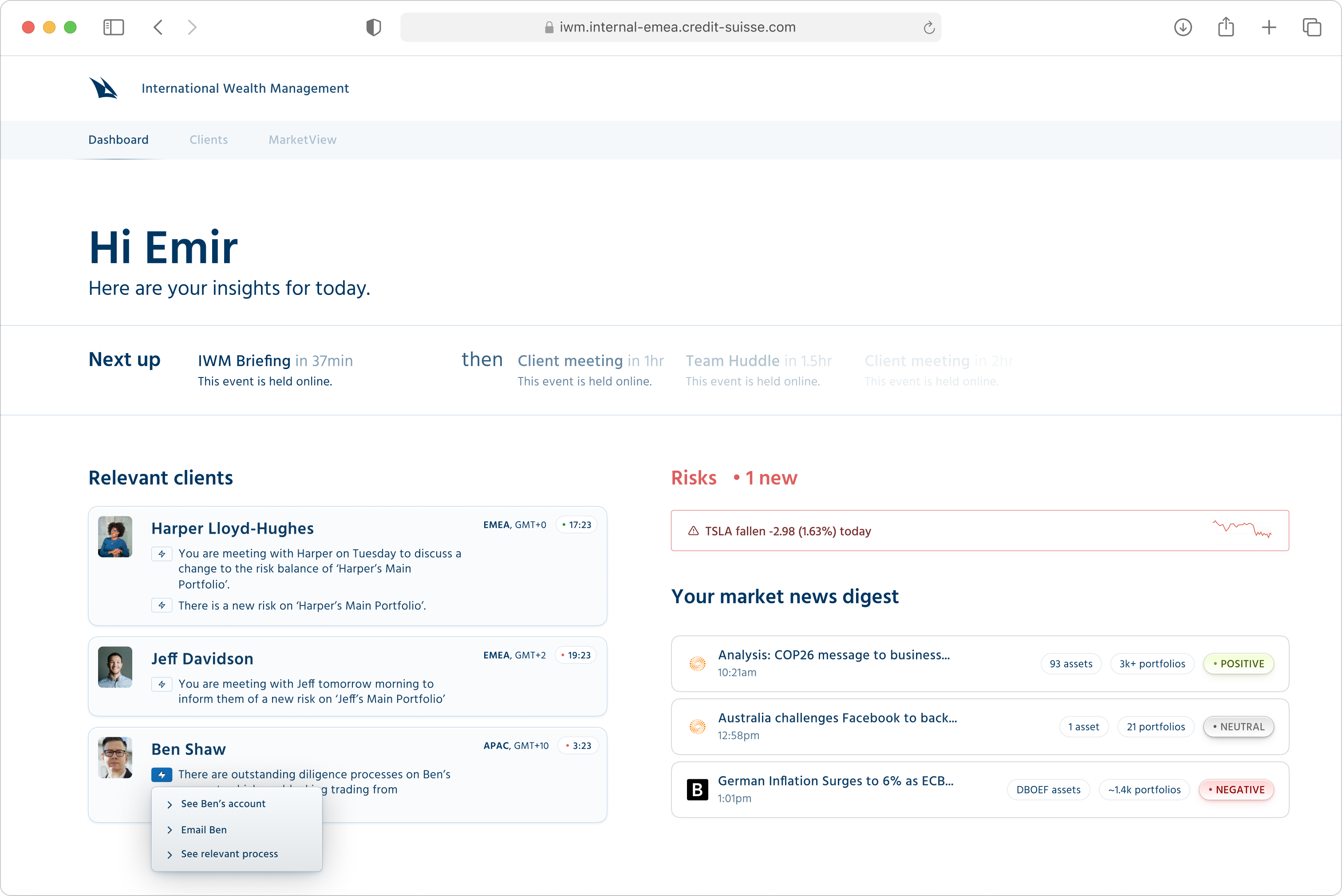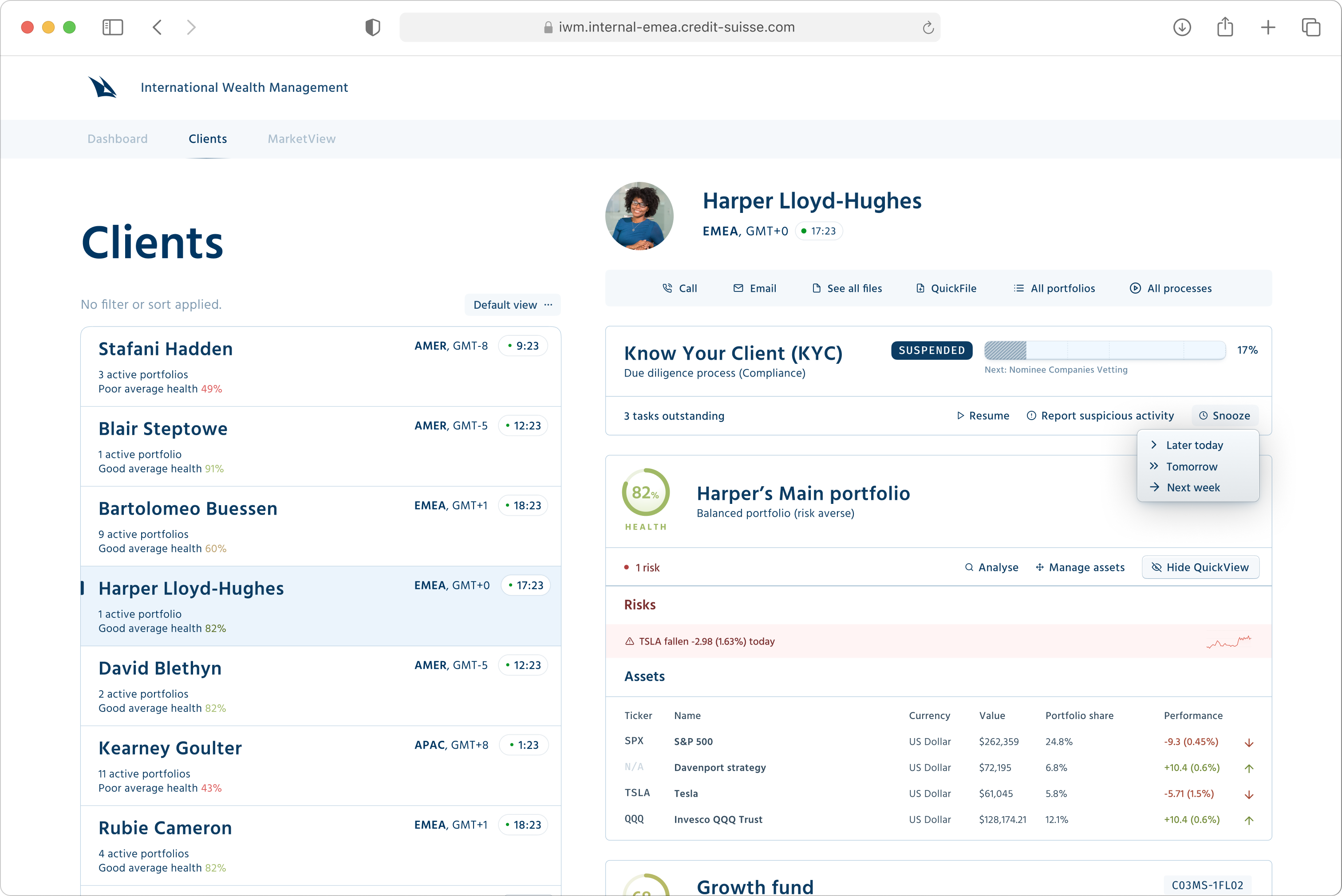 By finding out about a relationship manager's workflow, we conceptualised an intelligent client summary page. This captured details about: the client's contact details, legal requirements— due diligence and compliance processes; and a portfolio breakdown— overview of investments.